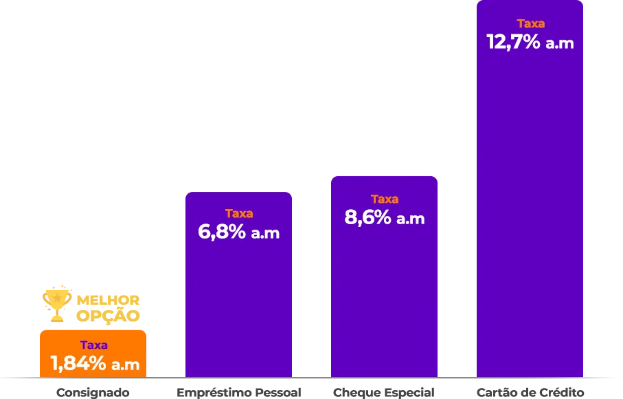 As taxas de juros praticadas no empréstimo consignado, cartão de crédito consignado, crédito pessoal, financiamento e consórcios são determinadas pelos bancos parceiros, conforme suas políticas e serão, sempre confirmadas e exibidas antes de qualquer finalização de contratação.